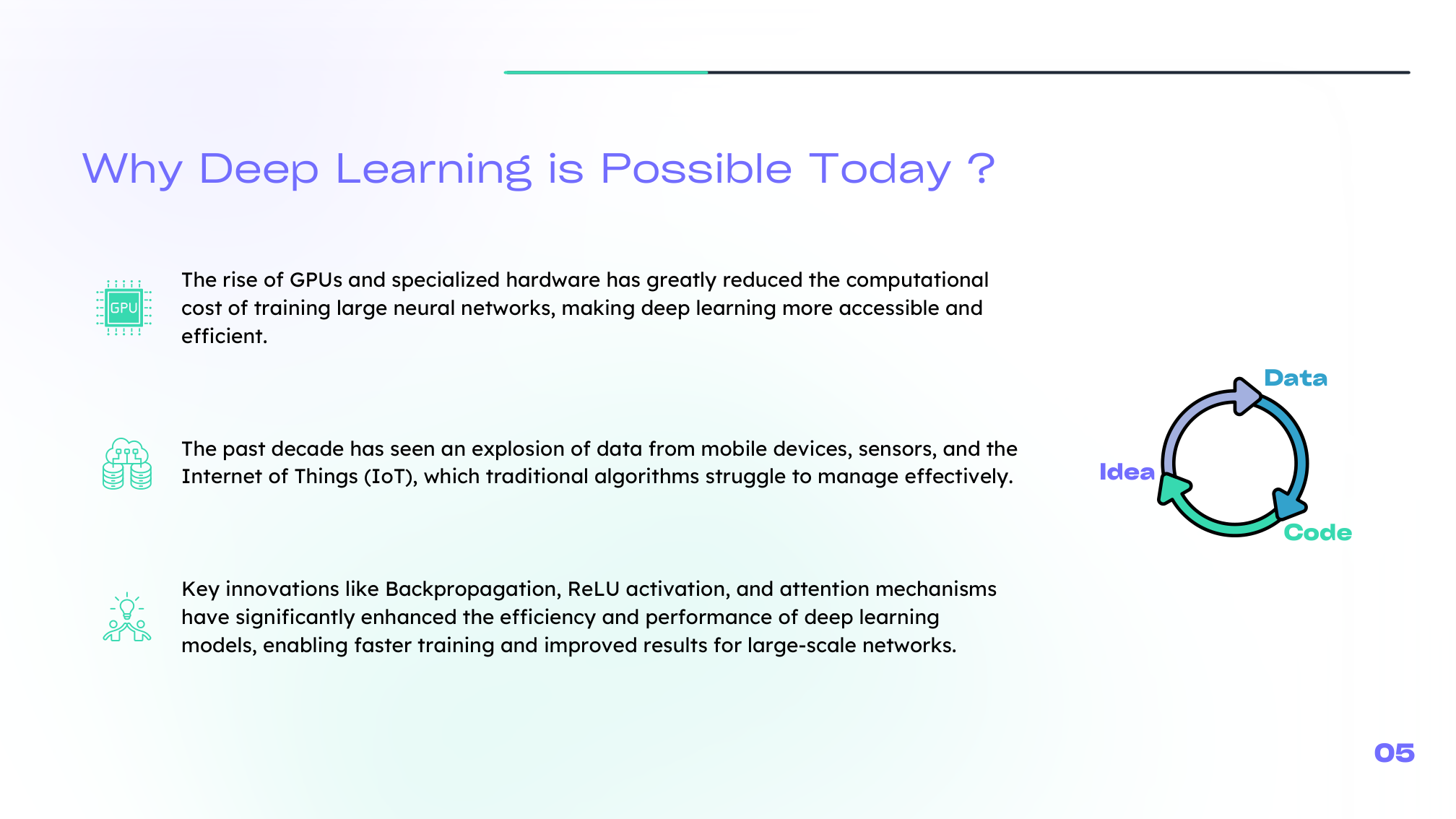 - Algorithms: backpropagation, ReLU-style activations, better initialization, and later attention-based methods made training stable enough to matter.
