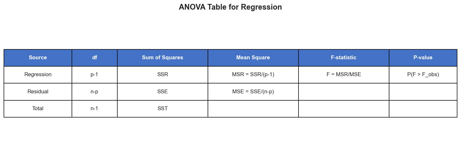 - MSR (Mean Square Regression) = \(\text{SSR} / 1\)