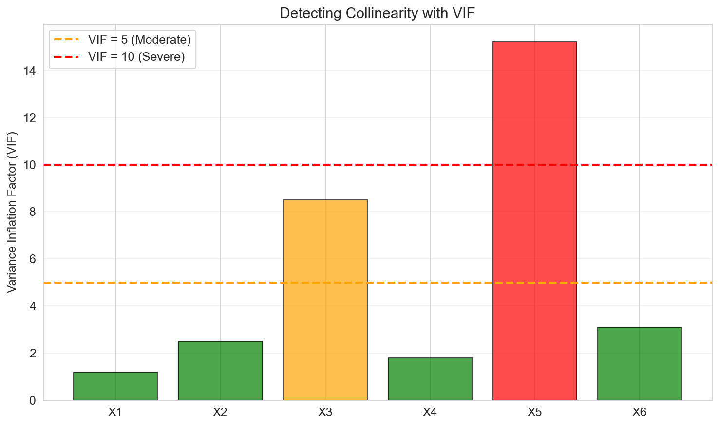 - \(\text{VIF} > 10\): Severe collinearity