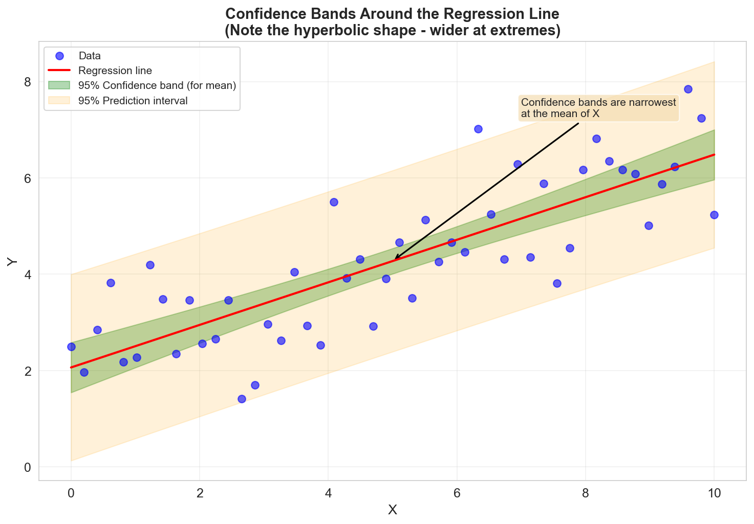 Note: In simple linear regression, confidence bands have a hyperbolic shape, wider at the extremes of the data range.