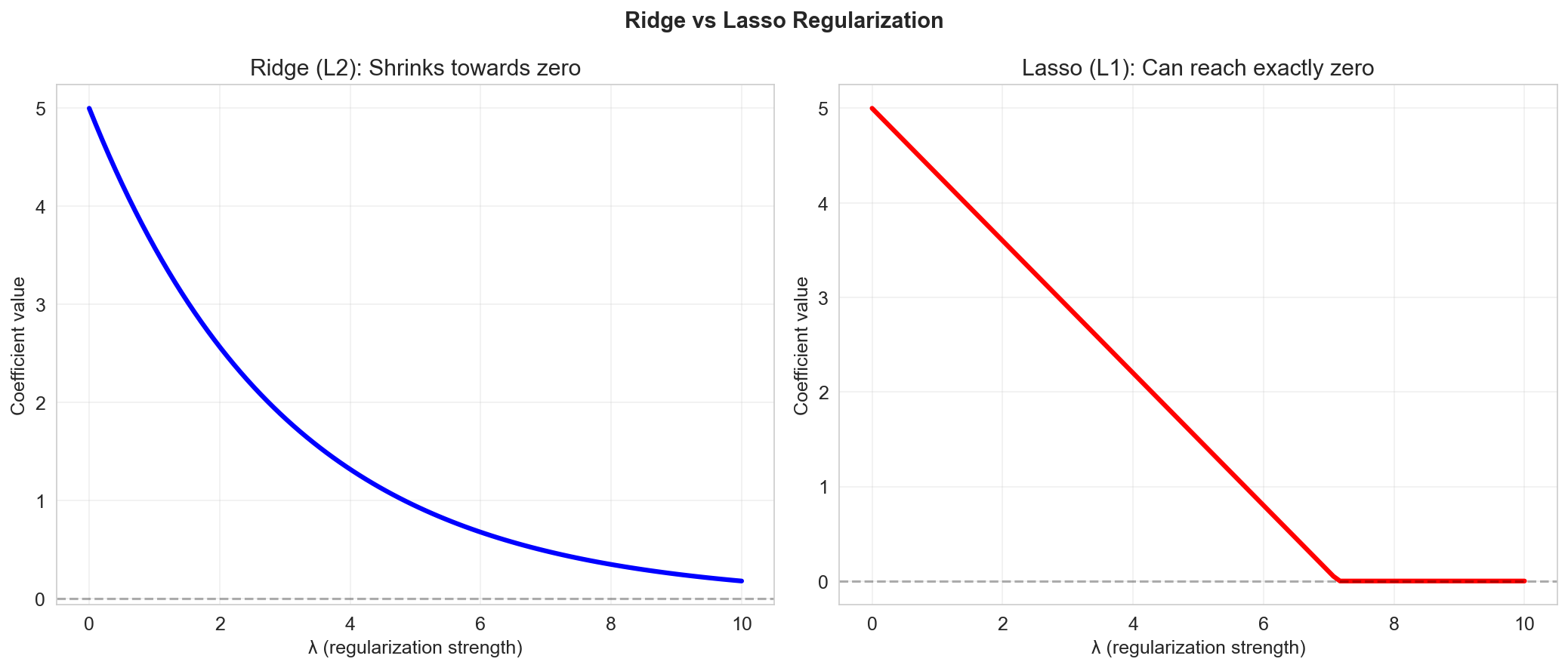 - Shrinks coefficients toward zero (but never exactly zero)