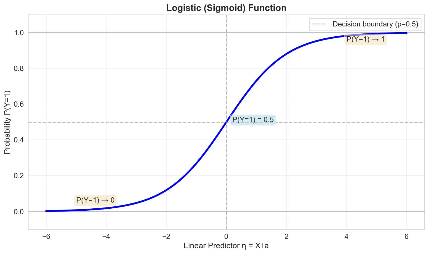 \[ \mu = g^{-1}(\eta) = \frac{\exp(\eta)}{1 + \exp(\eta)} = \frac{1}{1 + \exp(-\eta)} \]This maps the linear predictor \(\eta\) back to a probability in \([0, 1]\).