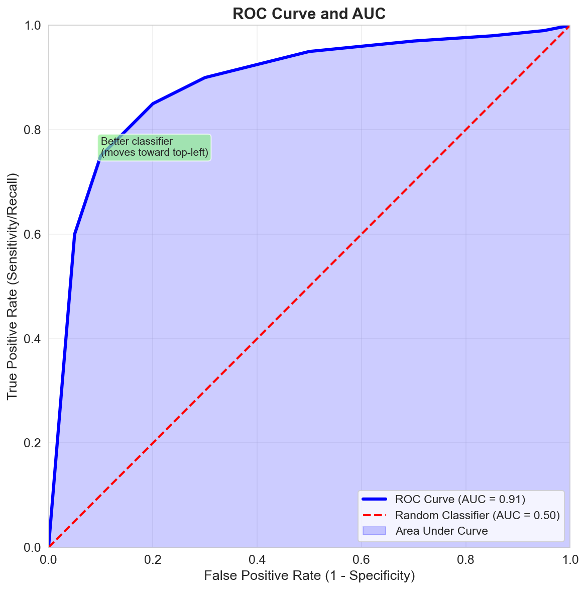 - Recall (Sensitivity): \(\frac{TP}{TP + FN}\)